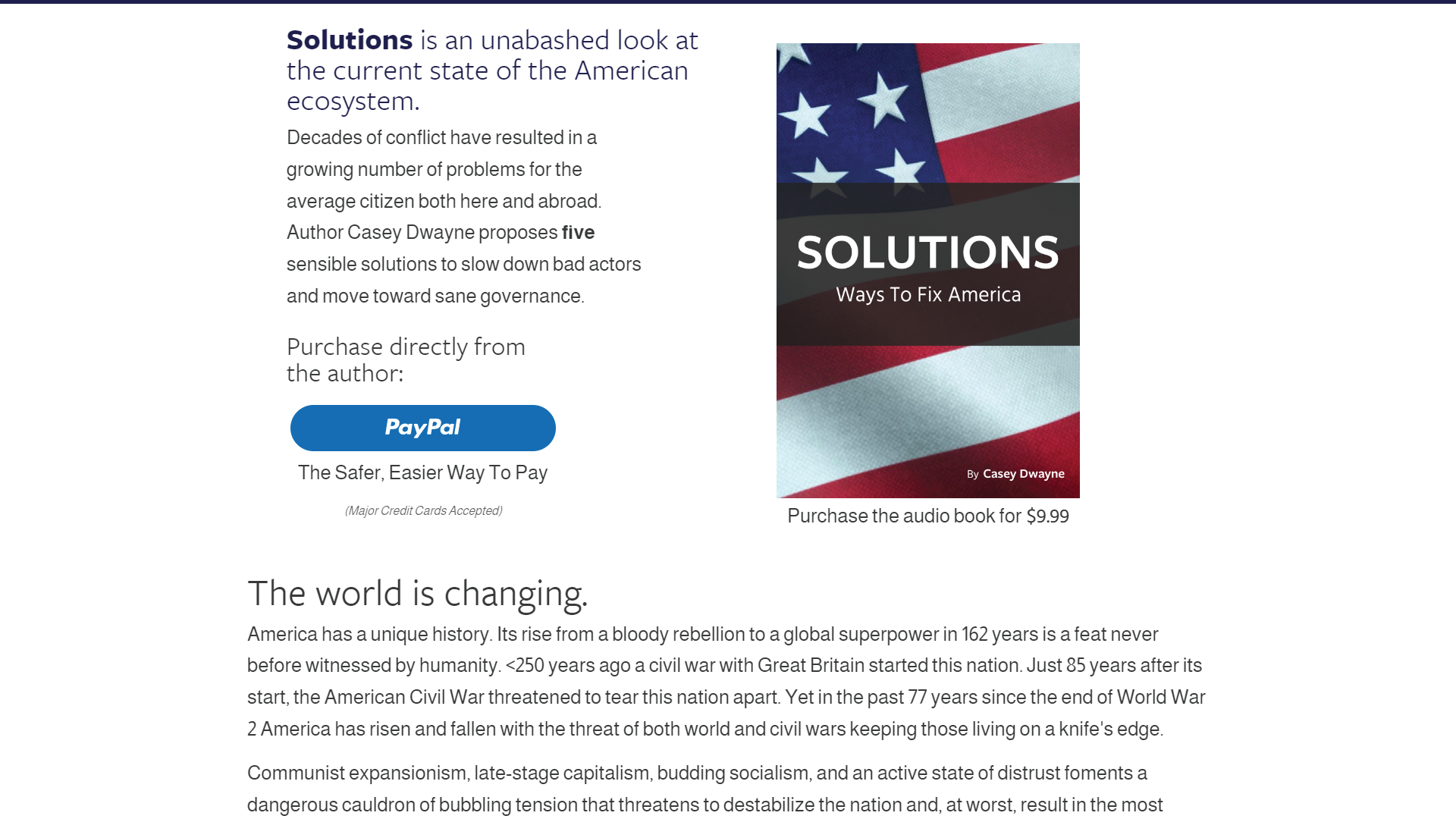 Ways To Fix America promotes a book I wrote in 2020 called "Solutions". It's a simple site that lets you buy and/or download the book/audiobook.